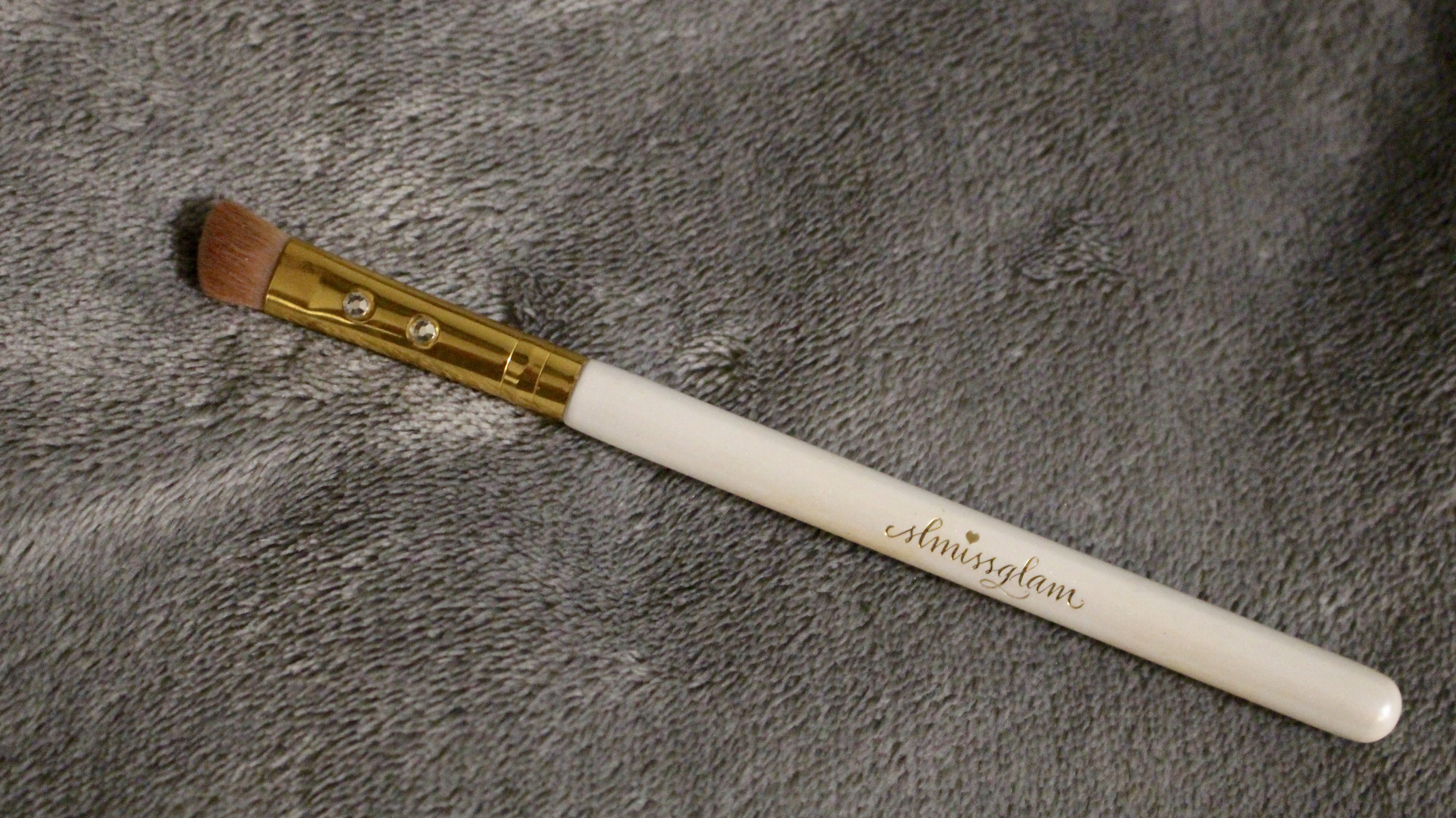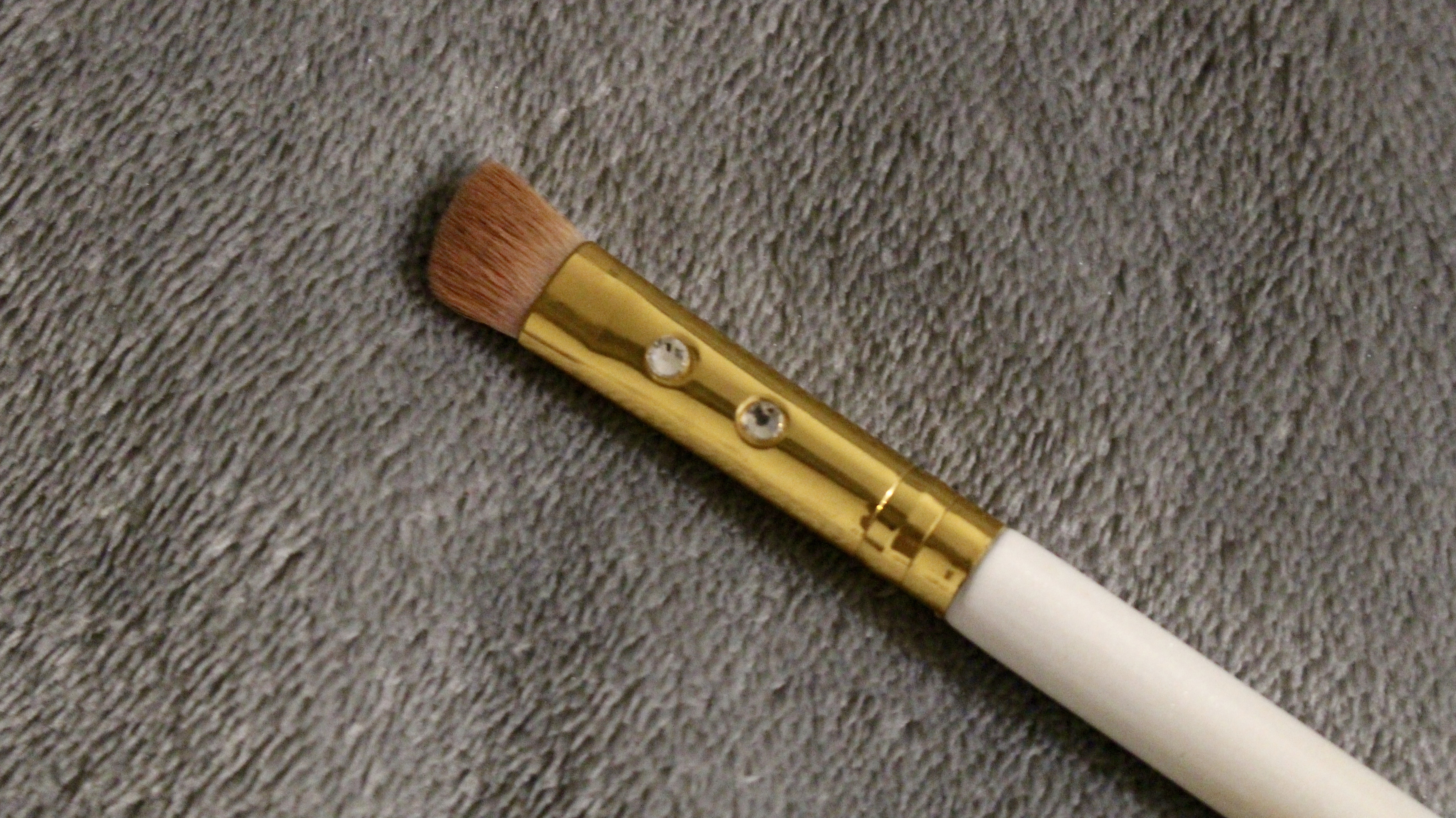 This brush is so cute! It has pink bristles and little gems on the handle. It also applies eyeshadow really well. The angular shape makes it easier to be precise (especially in the crease) and it helps the eyeshadow look more pigmented.